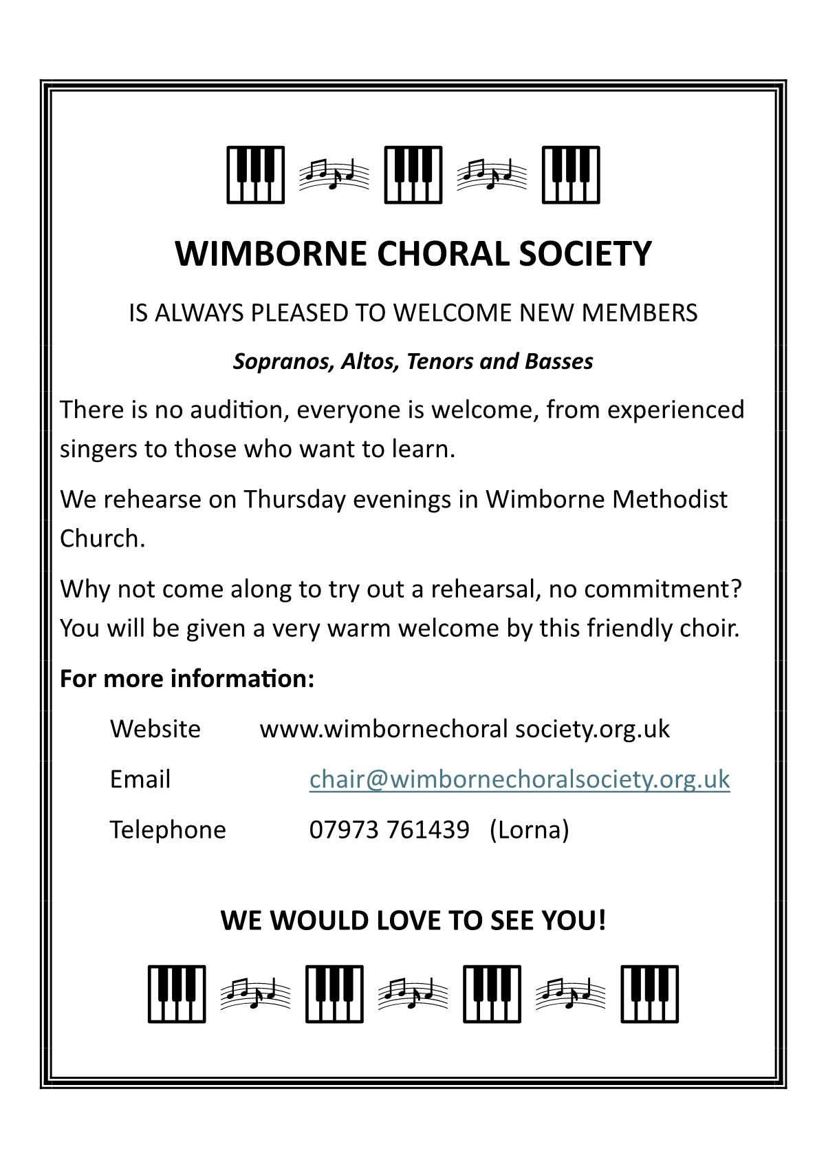Welcome to Wimborne Choral Society’s website. We hope you love beautiful choral music as much as we do.